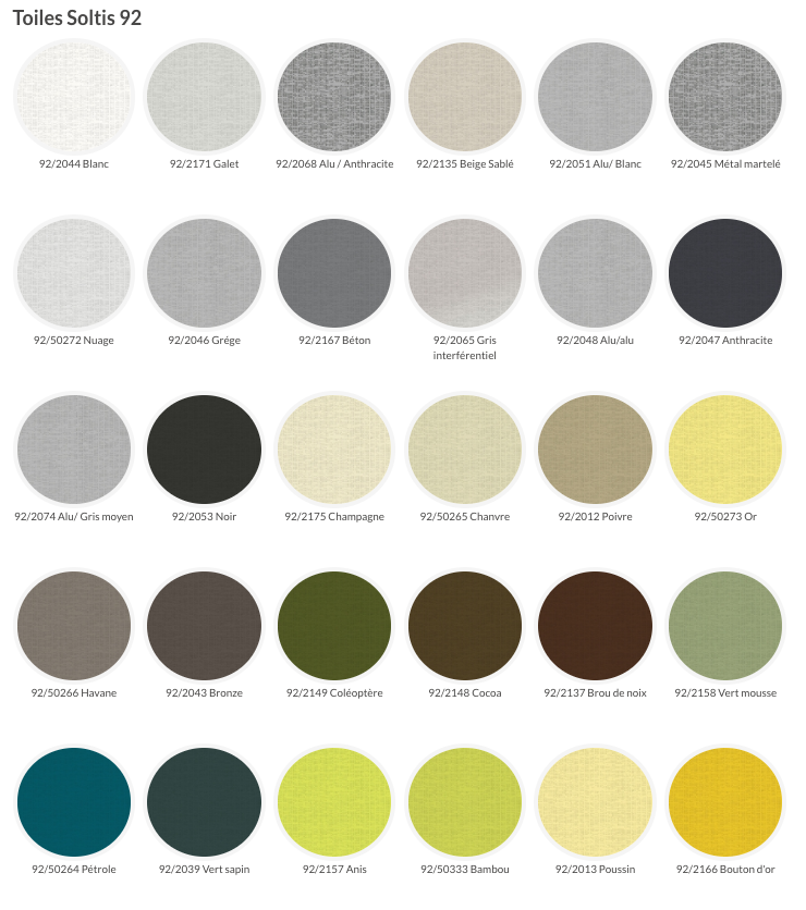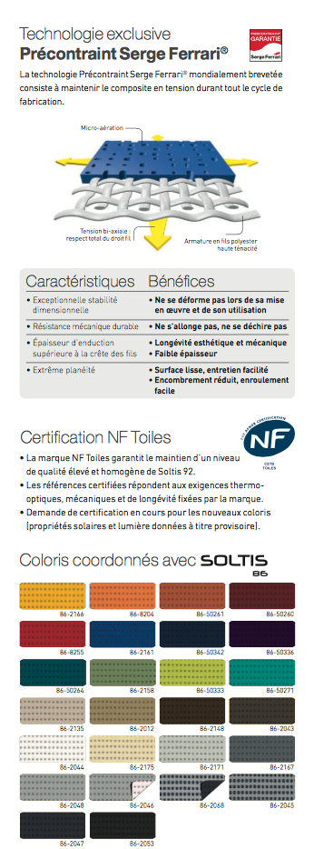 Découvrez ci-dessous les caractéristiques de la toile Soltis sur mesure 92, une solution d'ombrage innovante qui allie performance technique et esthétique pour améliorer le confort et la protection solaire de vos espaces.