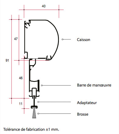 - Coulisses en aluminium anti-vent. Barre de charge de manoeuvre avec adaptateur et brosse mobile. Cordon de tirage 60 mm.