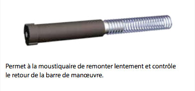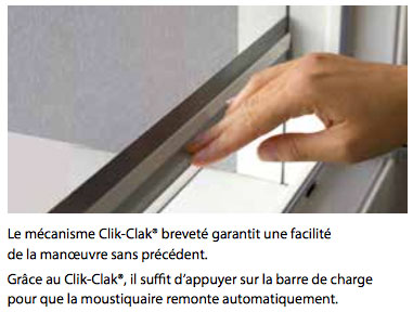 - Elle est dotée d'un ressort à remontée lente allié au système Clik-Clak® breveté qui permet d'ouvrir ou fermer la moustiquaire d'un simple geste de la main sur la barre de charge.